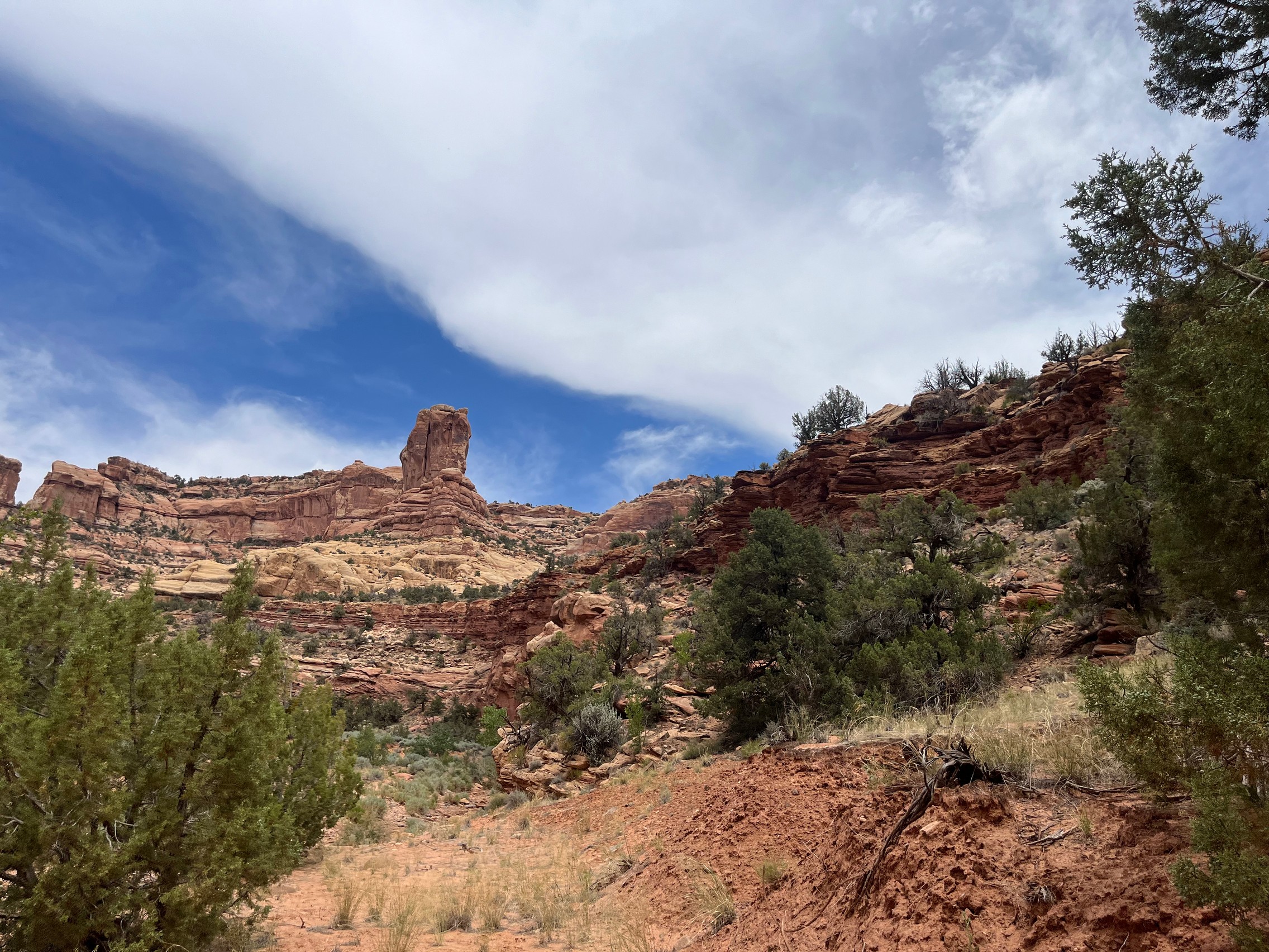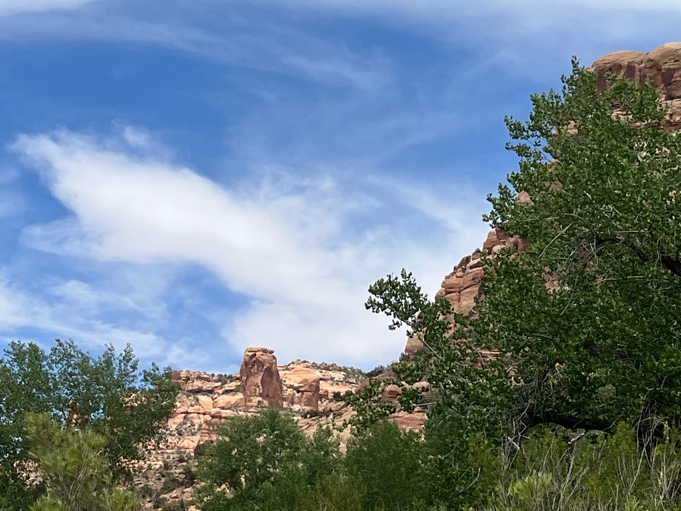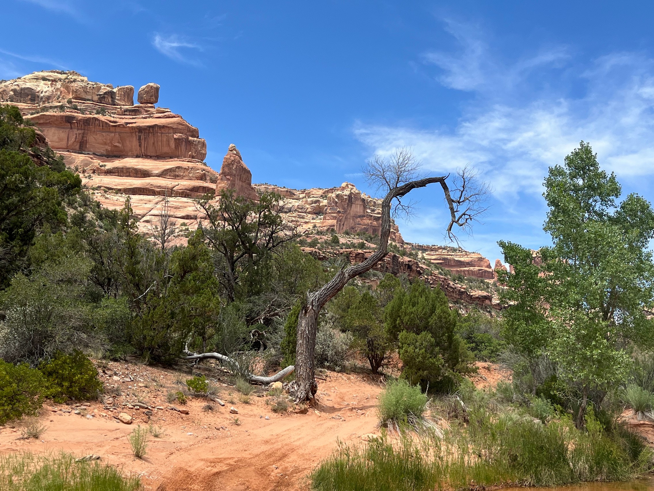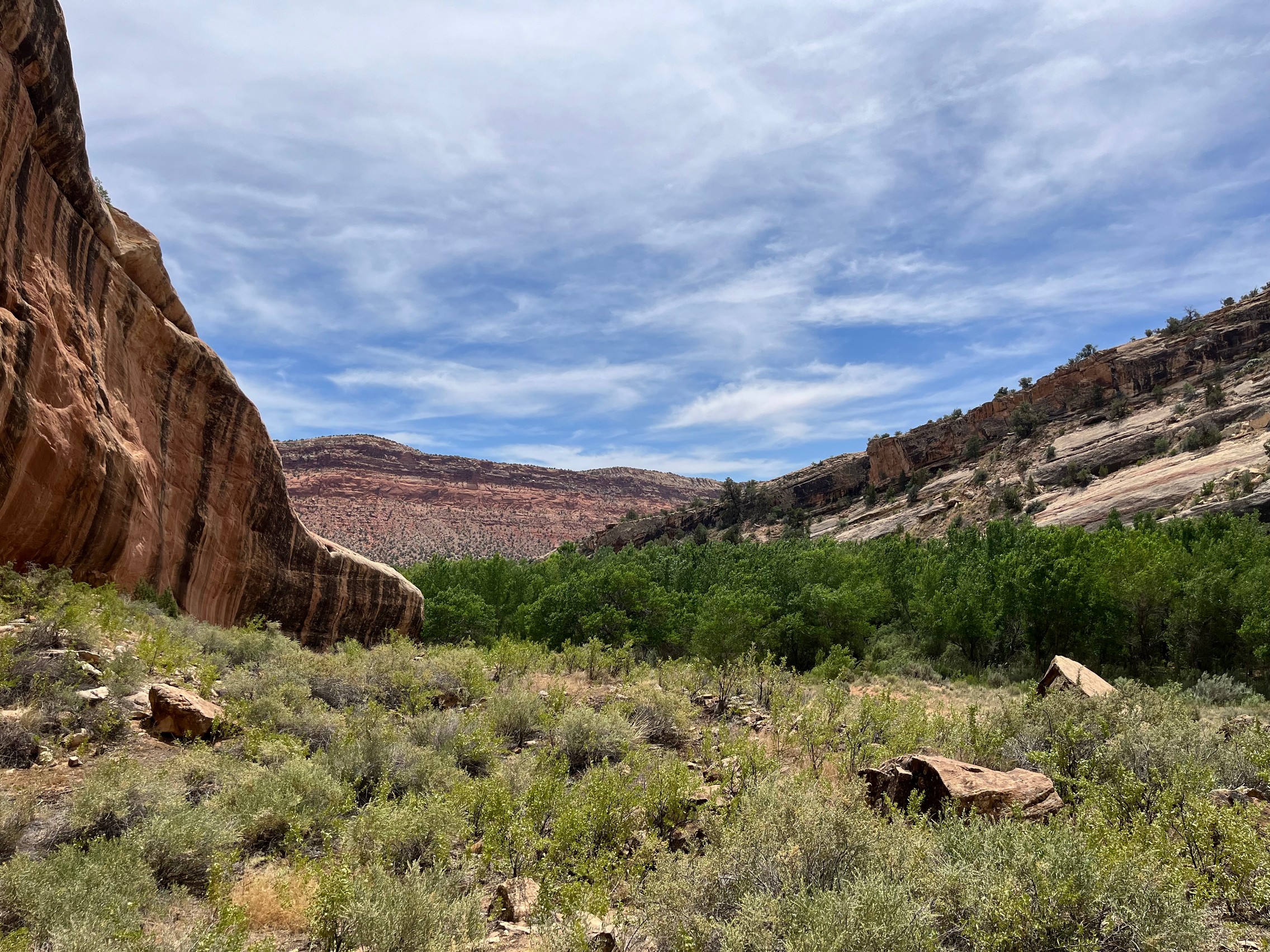 In the beginning, the trail was wet and muddy, but it was fun going back and forth across the creek. Everybody stopped at the first ruins of the Ancestral Puebloans. We walked around and explored the ruins a bit. Then we made our way down the rest of Arch Canyon.