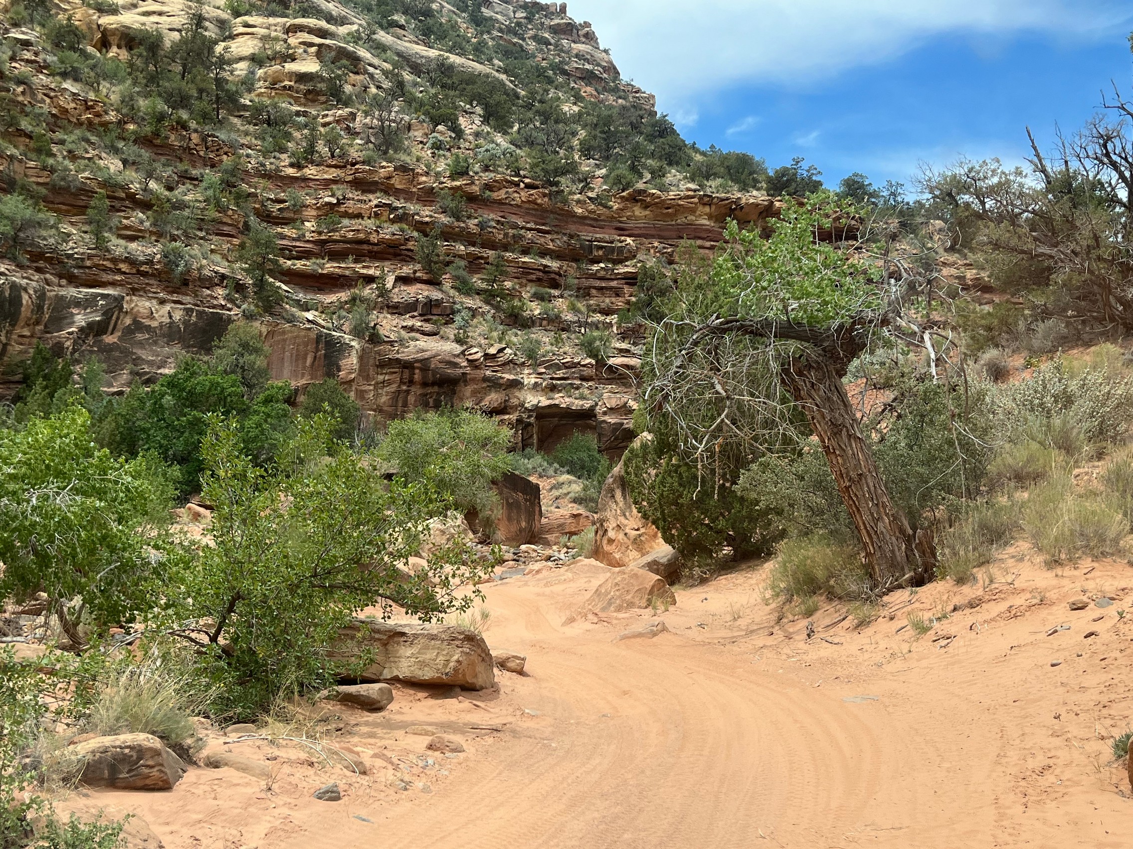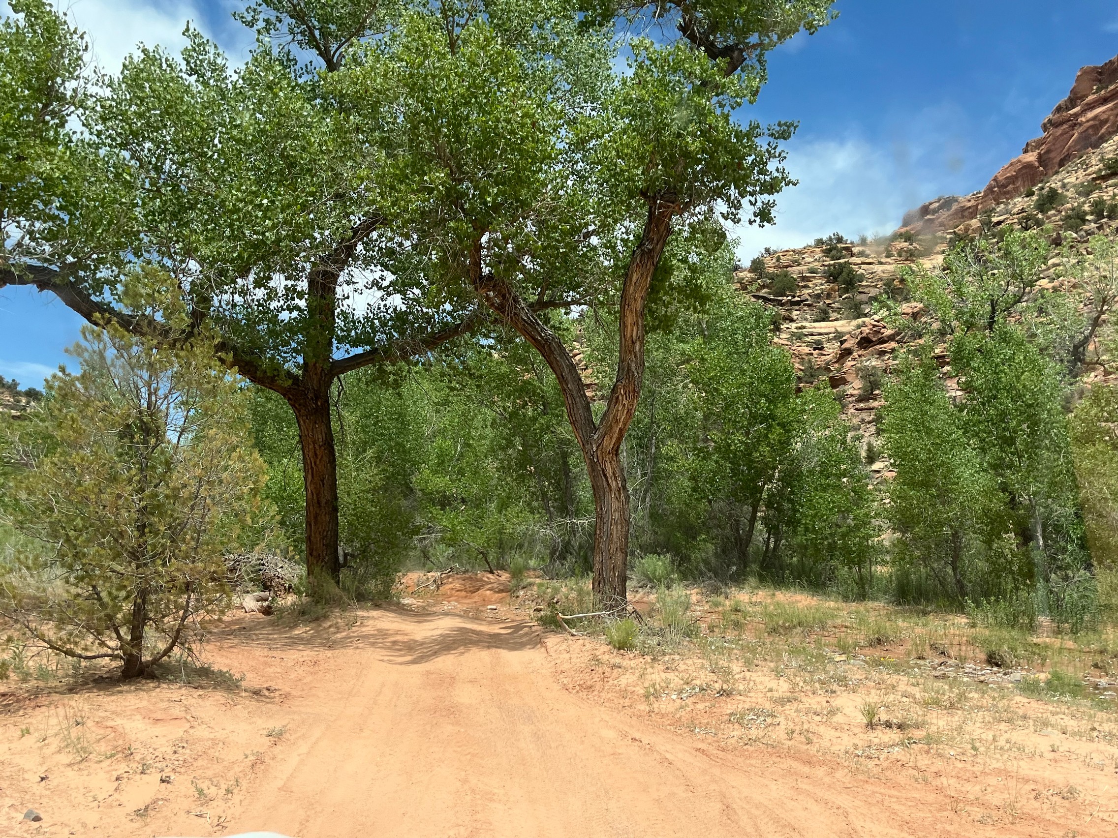 Arch Canyon was the second trail for the day. The first thing we did on Arch Canyon trail was to stop in the campground for lunch. The campground has a lot of trees for shade. After lunch, a few side-by-sides started driving down Arch Canyon. We went behind them.