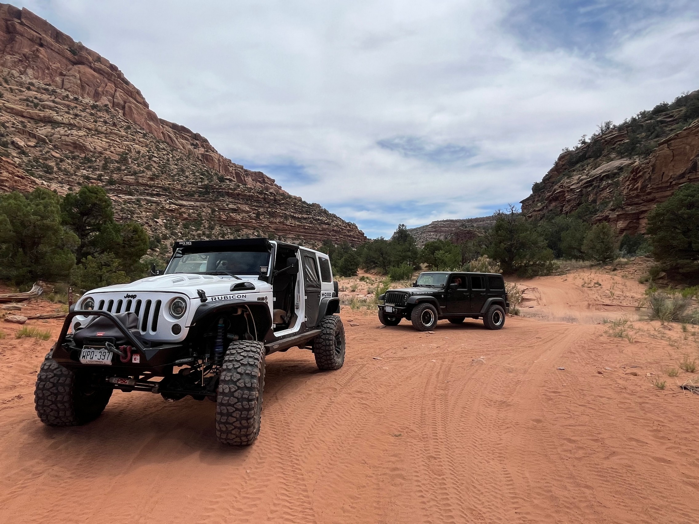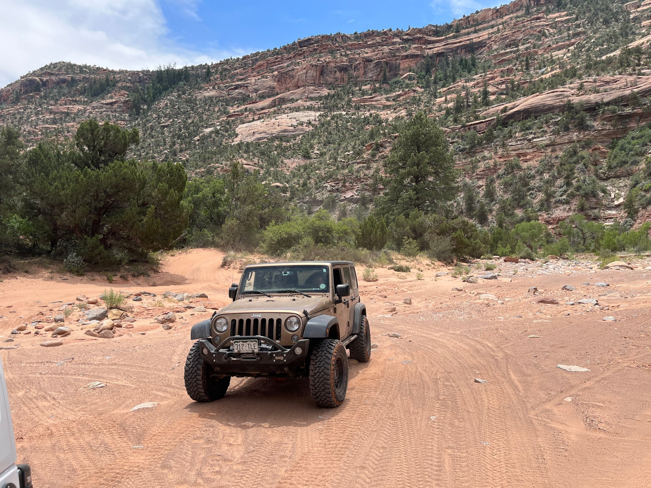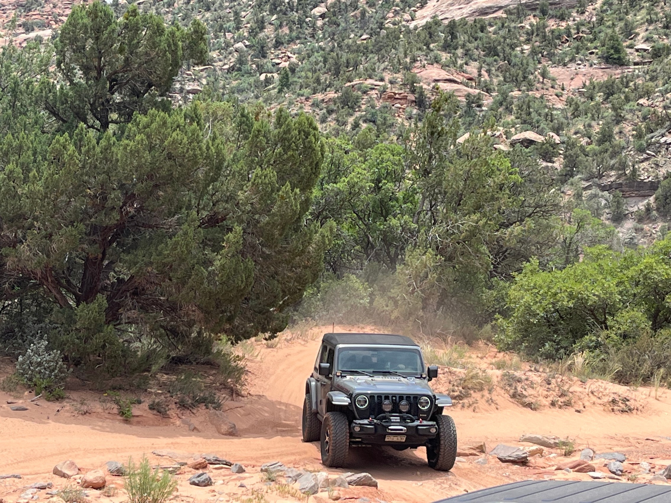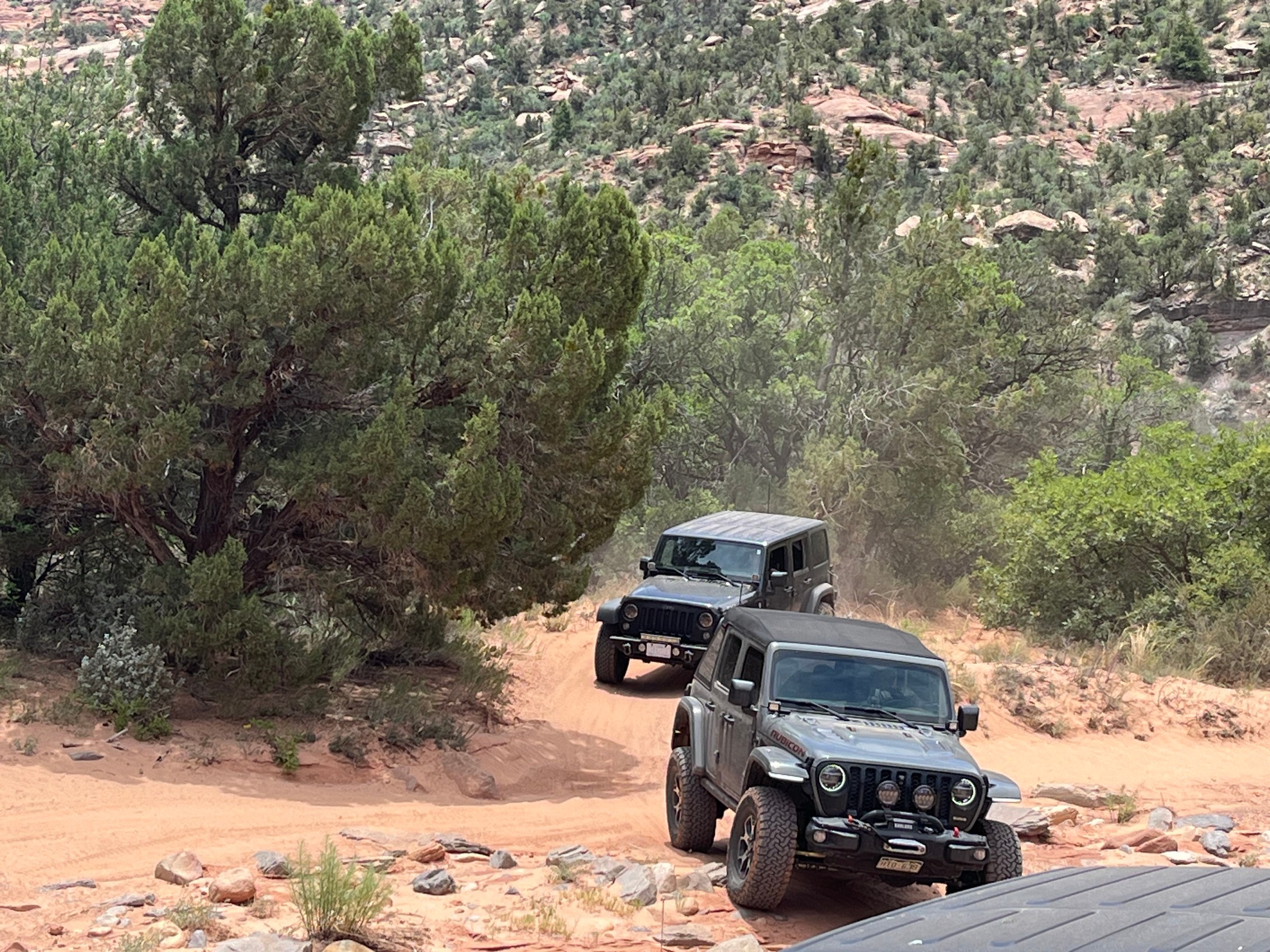 Just before the highway, they ran into Sean going slow. Sean said he had run into a rock and his steering was off. Matt and Julie looked at his Jeep, but could not really see anything wrong with it, so Sean drove it back to Blanding and had a shop look at his Jeep. The shop told him to take it to down the road to front end alignment shop, and they aligned the Jeep for him and that seemed to fix the steering issues for Sean.