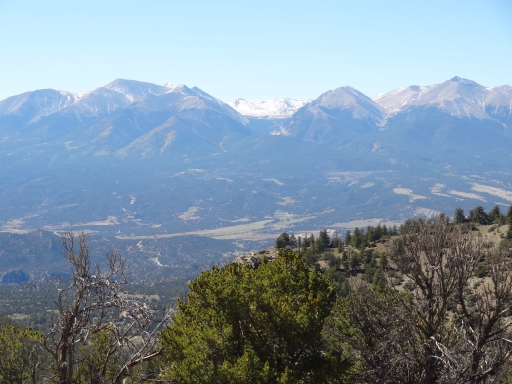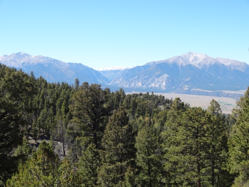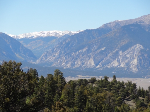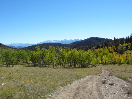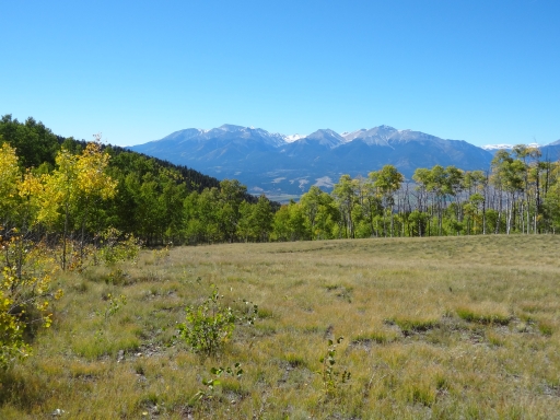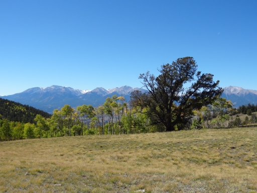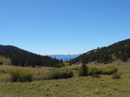 There was a bit more traffic on the trail here than we'd seen on the other trails. When we got to Coons Park we headed up to a campsite, hoping for some good views. We definitely found them. We hung out for a while, taking lots of pictures of the snowy mountains to the west and the aspens below and to the south of us. It looked like it was going to be a very scenic trip.