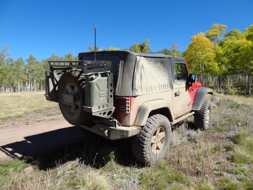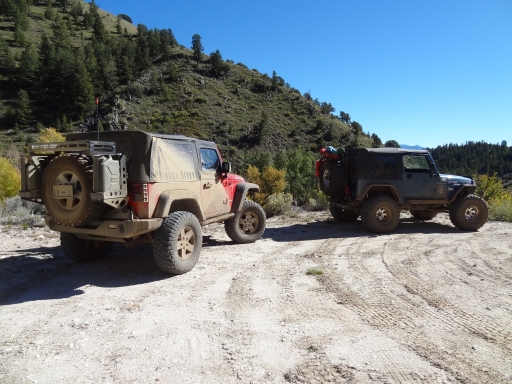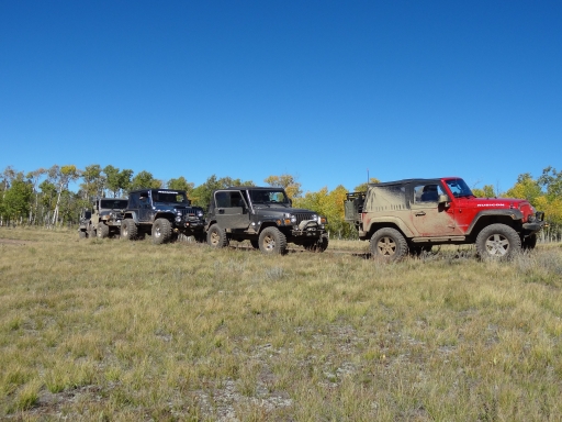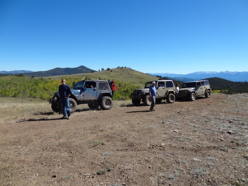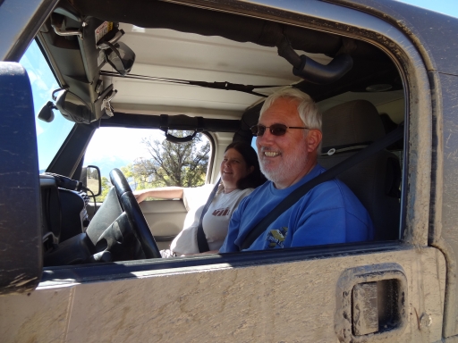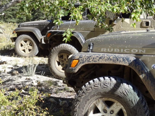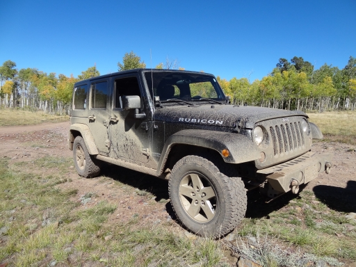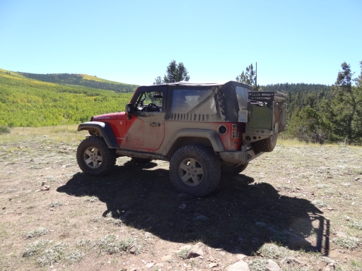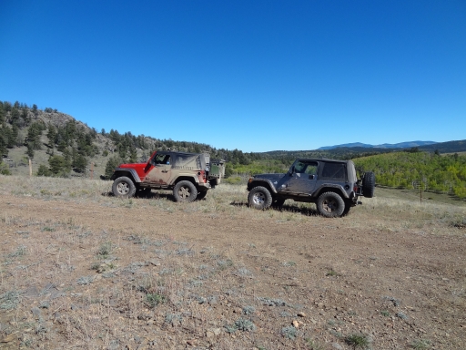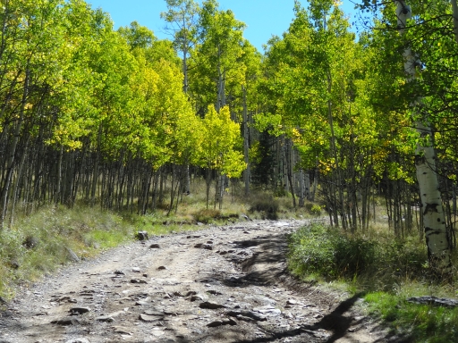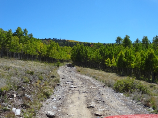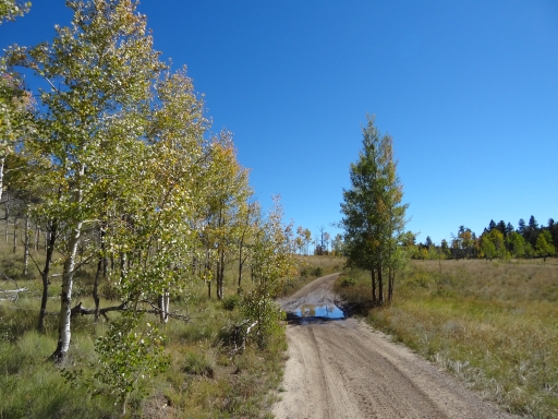 We passed through the seasonal gate, and we would stop another time for pictures. However, we would mostly continue south along Aspen Ridge through aspen trees and between meadows. There were even some rocky spots made more fun by mud and water. We passed a rental car on its way in and we wondered how it would do in the rocks.