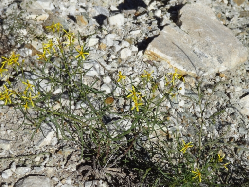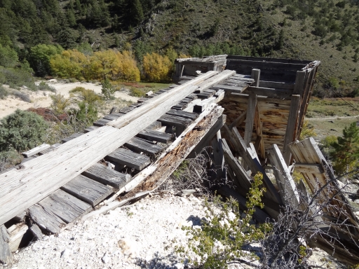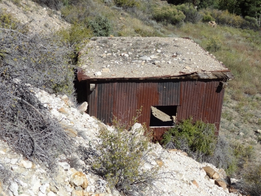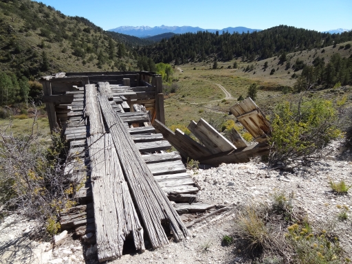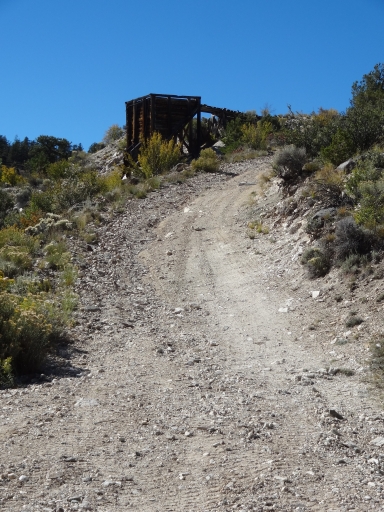 In Marble Quarry Gulch the dirt and rocks turned white. We saw a mine off to the left of the trail so we went to check it out. That was a nice diversion. There were two large parking areas at different levels up to the topmost mine, and we stopped at both. There were two old structures and leftovers from two quarries, but there wasn't much to explore. Still, the weather was perfect so we enjoyed the blinding white scenery and surrounding mountains. We also saw new, white poles making a line through the scenery and wondered what they were for.