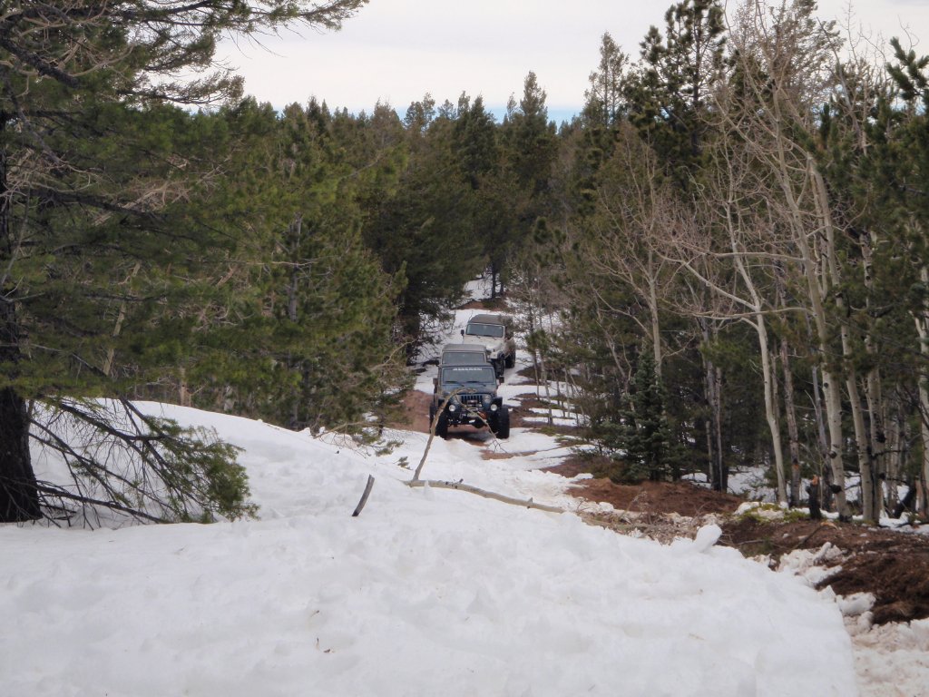 We stopped for a short break, and saw that we would probably run into the first group of four-wheel drive trucks that went down the trail before us. So, after the short break, we went 50 feet or so and ran into the group of three trucks and Jeeps.