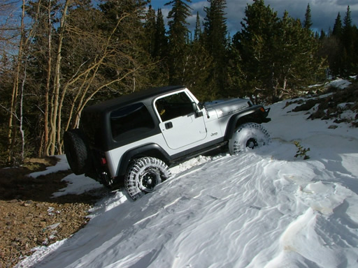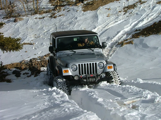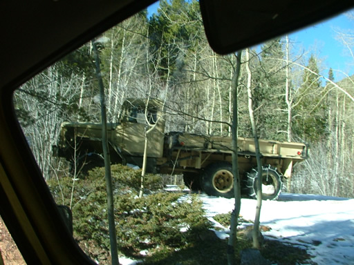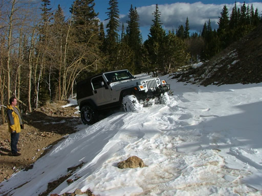 We decided to check out the Ben Harrison Mine on the way out Spring Gulch. The hill there is pretty big, and could be fun. Joey walked around and decided that it was too difficult to get there. Dane went down a different hill instead, and then realized he was trapped down there. The snow was a few feet deep, and Dane couldn't get back up. He worked on another escape route, but in the end he had to use Gary's Jeep as an anchor and winch himself out. Even though he was stuck down there for awhile he still had a blast.