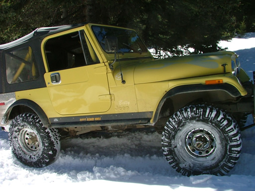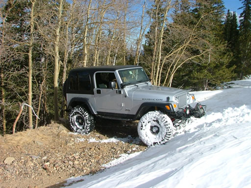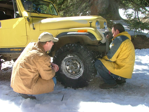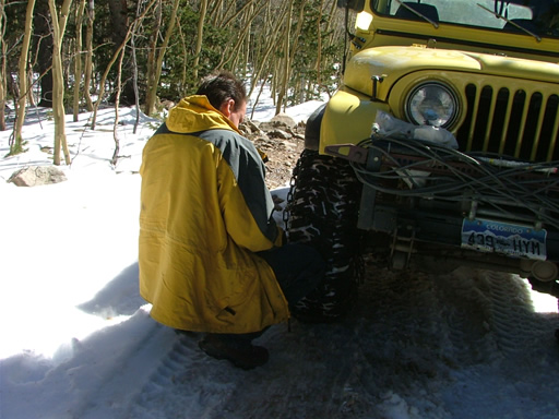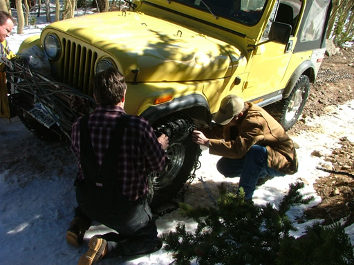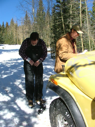 Gary gave it a few tries and it got to be too much. Dane had chains, so we put them on Gary's front tires. It didn't really help, though. Instead of not having any traction at all, Gary could now dig all the way through the snow pretty quickly so he could get high centered on the snow.