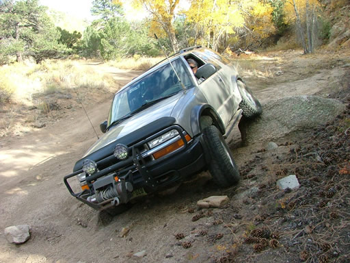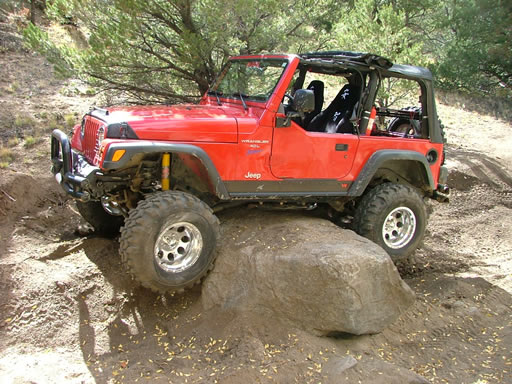 There is an optional rock in the trail just past all of the rocks in the wash and Monica gave it a try. It turned out to be just a bit too tall and all she could do was get high-centered on it. Bob and Ladd tried it too with no luck. This is one of those "35-inch tire" rocks. Monica and Bob both managed to leave a little scar on their front drive shafts from it.