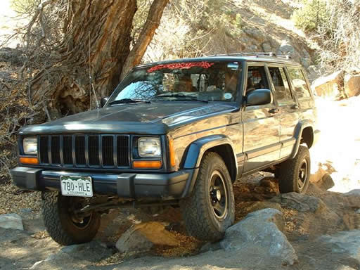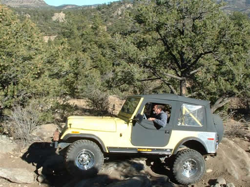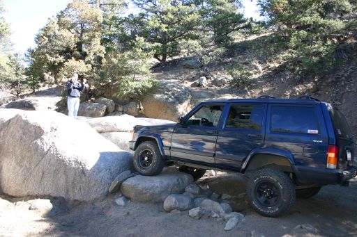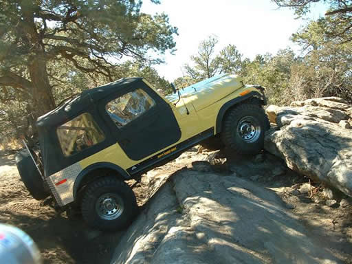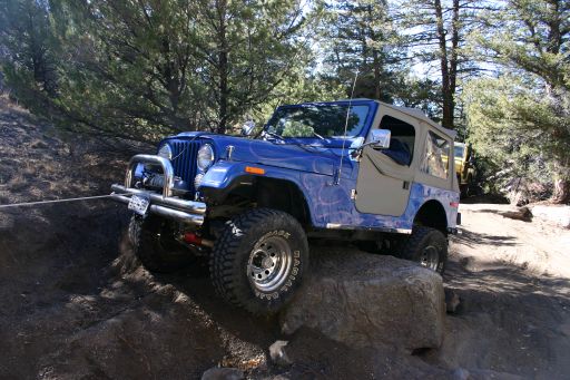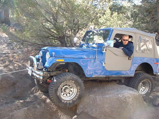 Next was the waterfall of Whale Rock. Ladd cruised up the center line with no issues, followed by Dave. We had a little trouble with getting Mike up the rock. Mike got new tires with tread, but he lost some clearance. A bit of stacking and driving skills and he was up. We un-stacked and Ed powered right up. Gary came last and he decided to try a line just to the right of the "V" crack. As we've seen in the past, your driver's side tire will really come up when you do that line. Gary's CJ perhaps lifted more than most so he backed up and got a better line and was up no problem.