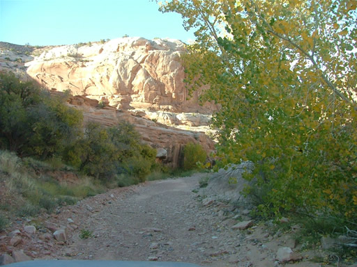 The trail started out as expected, wide and mellow. Then it suddenly got narrower and rocky as we wound through a dried-up riverbed. The Cottonwood trees were half yellow and half green and very leafy, making the trip through the canyon very beautiful. This was already a nice trail.