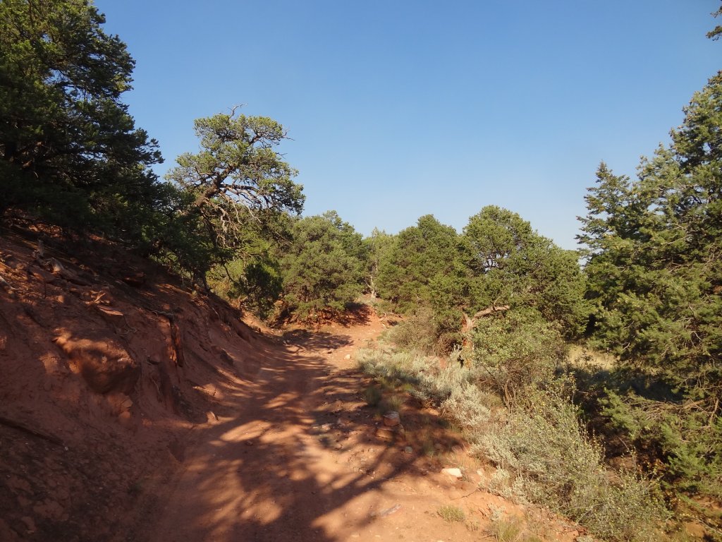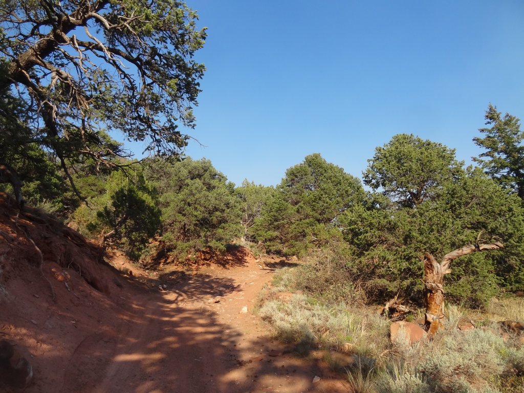 After the deep quarry hill, the trail immediately changed. The trail became a dirt track with rocks in it, red like the trails we see all the time around Moab. Even the trees looked like Utah trees. It was a sudden and strange change, but we enjoyed the quick, imaginary trip to Utah.