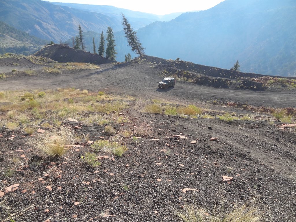 We came around a corner and found trails all over the place at a huge hill. Monica drove up the main trail up it and obviously didn't have enough momentum. A few yards from the top, the little rocks were very deep and she sunk in like she was on snow. She wasn't going to make it to the top, so she backed down. Then she gave it a lot of gas and powered up, still having to fly up and over the top in order to not get stuck again. Fun!