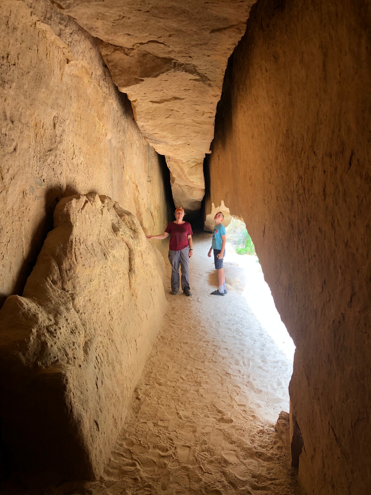 When we got to Whispering Cave, we of course had to stop and go into the cave. Matt tried to go far back to the left, and to the right, but the space was not quite big enough to go far. We looked up and saw how the cliff was split into a cleft very far into the whole cliff -- it was amazing to see. It was nice and cool just inside that little opening. We could hear and feel the wind going through the cave, though we could not see where it came from.