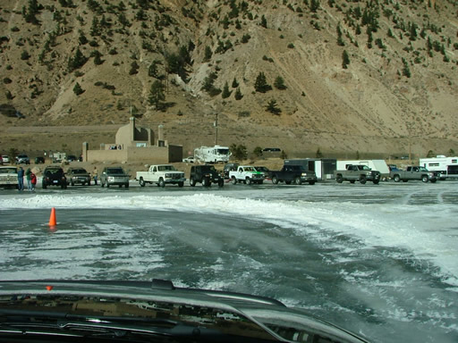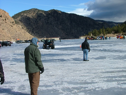 Everything got an extremely late start, largely because of the wind. They had the Street Stock track all set up, then the cones blew across the lake in a major gust of wind. People chased them across the ice but they still lost about five cones over the spillway and even found a couple in the trees.