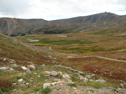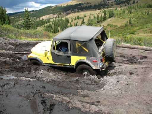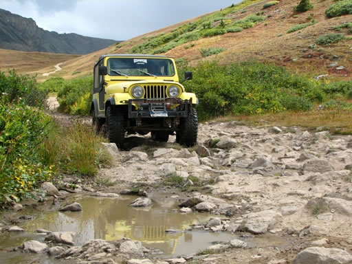 We decided to try the Birdseye Gulch trail which begins near the base of the switchbacks. The first 1/5 mile had a smoother surface than the Mosquito Pass trail. It then becomes rocky with two sections (one level and one sloping) requiring a good line for a stock vehicle. There is a long, rutted, sloping section that could be interesting in wet weather. After a shallow, small stream crossing there is an extensive marshy area with deep, soft, black mud. Gary tried to cross this section in two locations and needed the help of a strap to return back to solid ground. We decided to return and attempt the remainder of the trail another time.