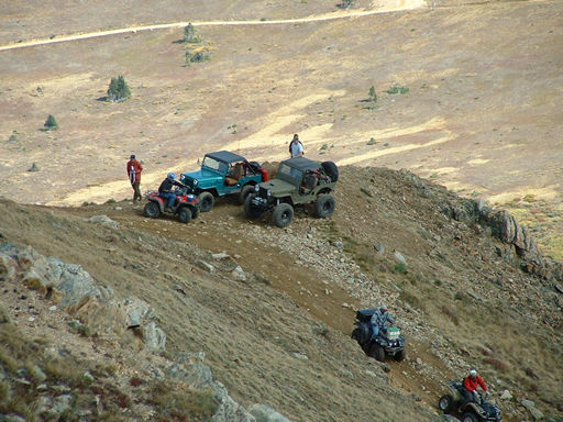 We conquered this steep trail right after Red Cone. It's a string of steep, rocky hills and switchbacks that carry you over the Continental Divide, across county lines, to the top of the mountain. We did this short trail with people behind and in front of us, like rush hour in the middle of nowhere. It was a great adrenaline surge all the way through, though it ended too quickly. We spent some time at the top taking a look at Red Cone from a distance and the trails we came on, while talking Jeeps with a bunch of strangers.