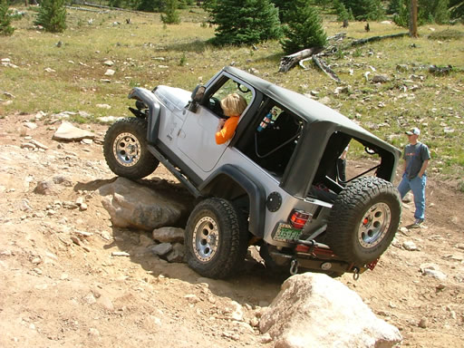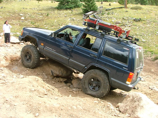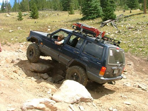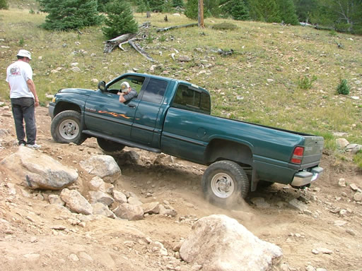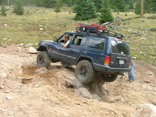 Mike V. tackled it with his Cherokee and with spinning tires he made it up and through the obstacle without too much trouble. Nice job! Kendall had his big truck with him on this trip so he got a tire up on one of the smaller rocks and called it good.