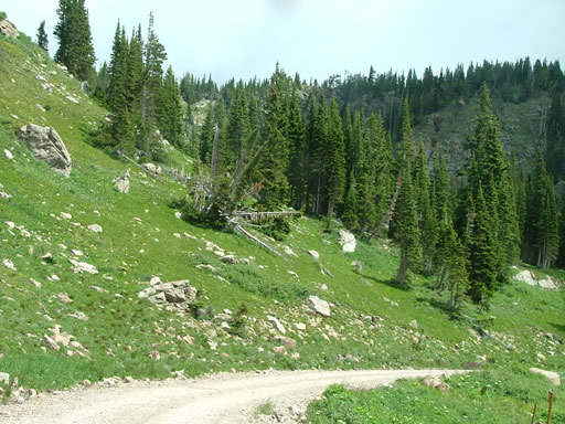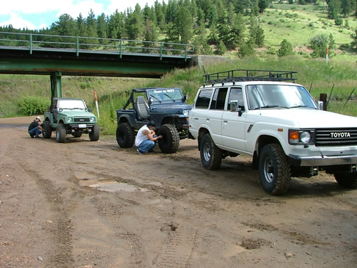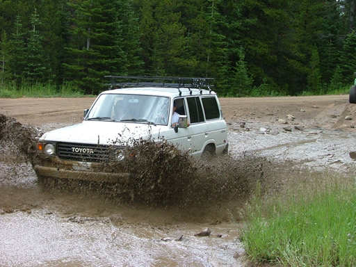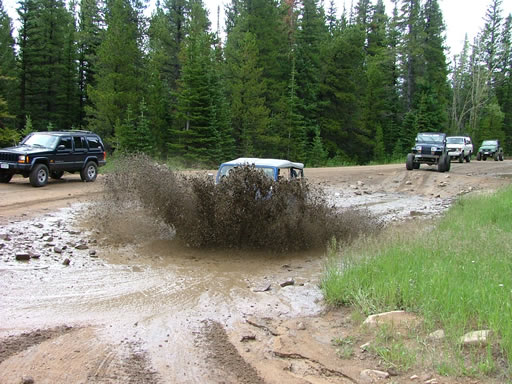 There were a few other cars and motorcycles on the trail, generally pulling off to let us pass (in the case of the cars), or passing us. We all avoided the big perpetual mud puddle on the way up before one of the switchbacks. We were making an (what would later prove to be in vain) attempt to not cover ourselves with mud right from the start.
