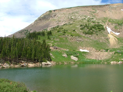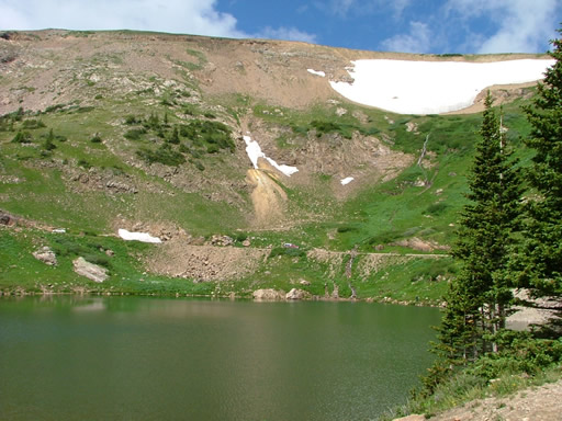 We kept up a pretty good clip, and it didn't take long to reach Yankee Doodle Lake, still with snow very near above it on the side of the mountain. The trail was clear of snow, though, and it looked to be a good run ahead of us.