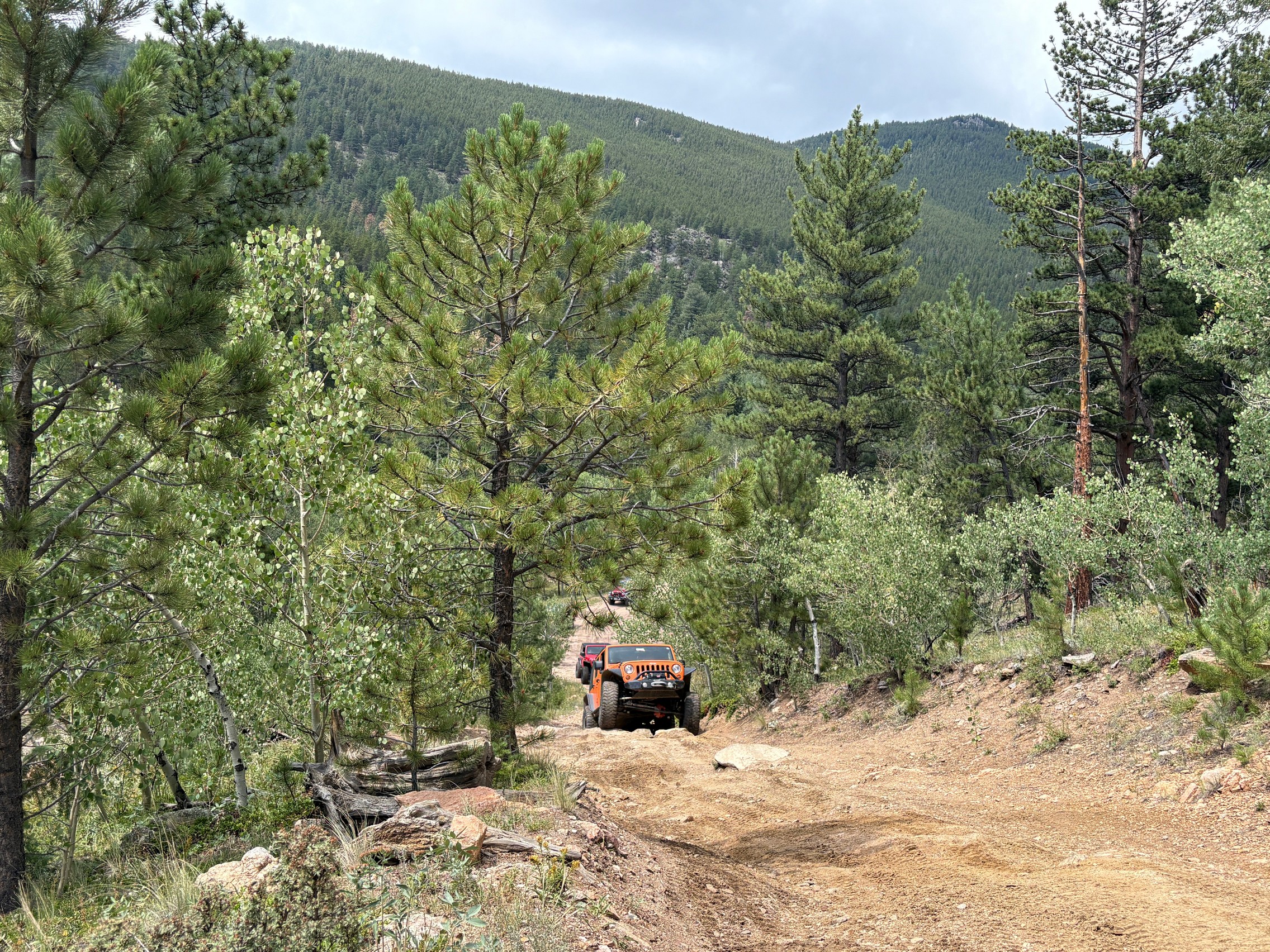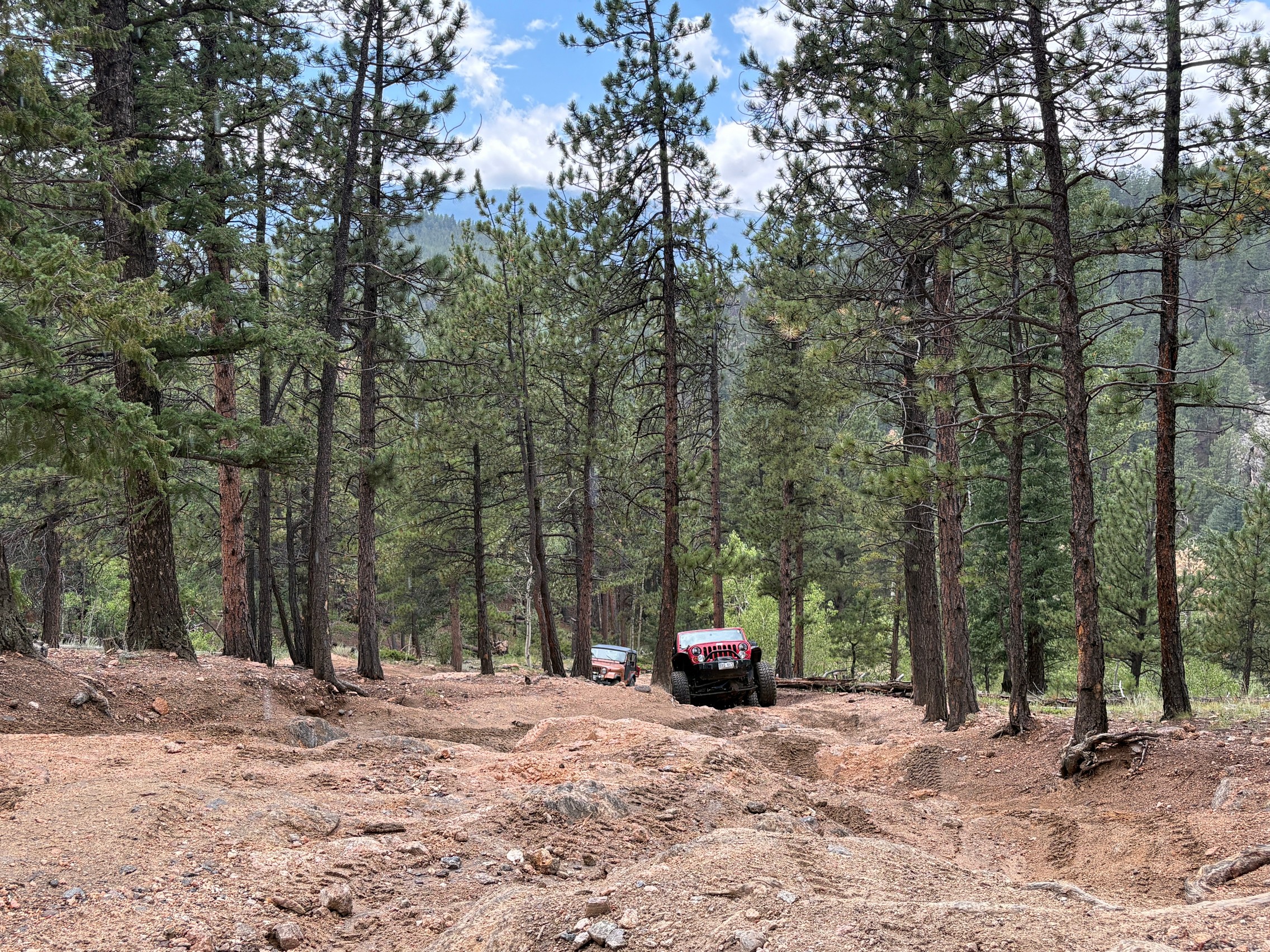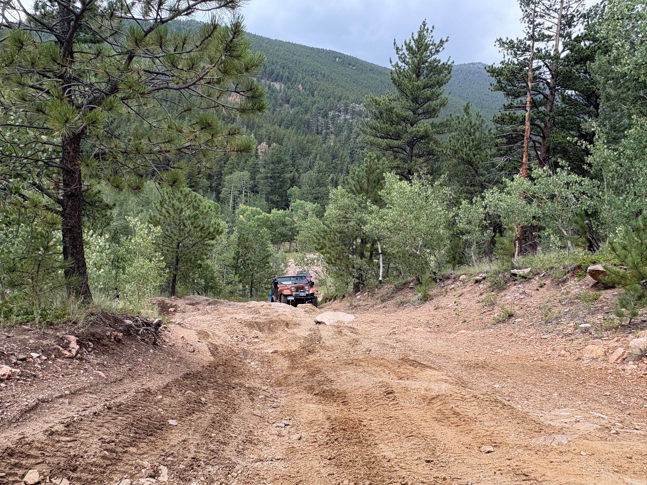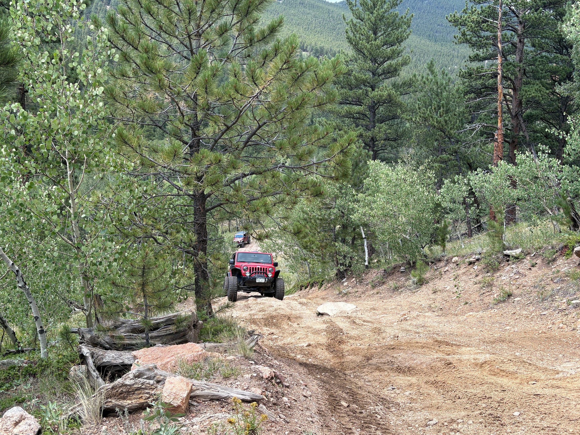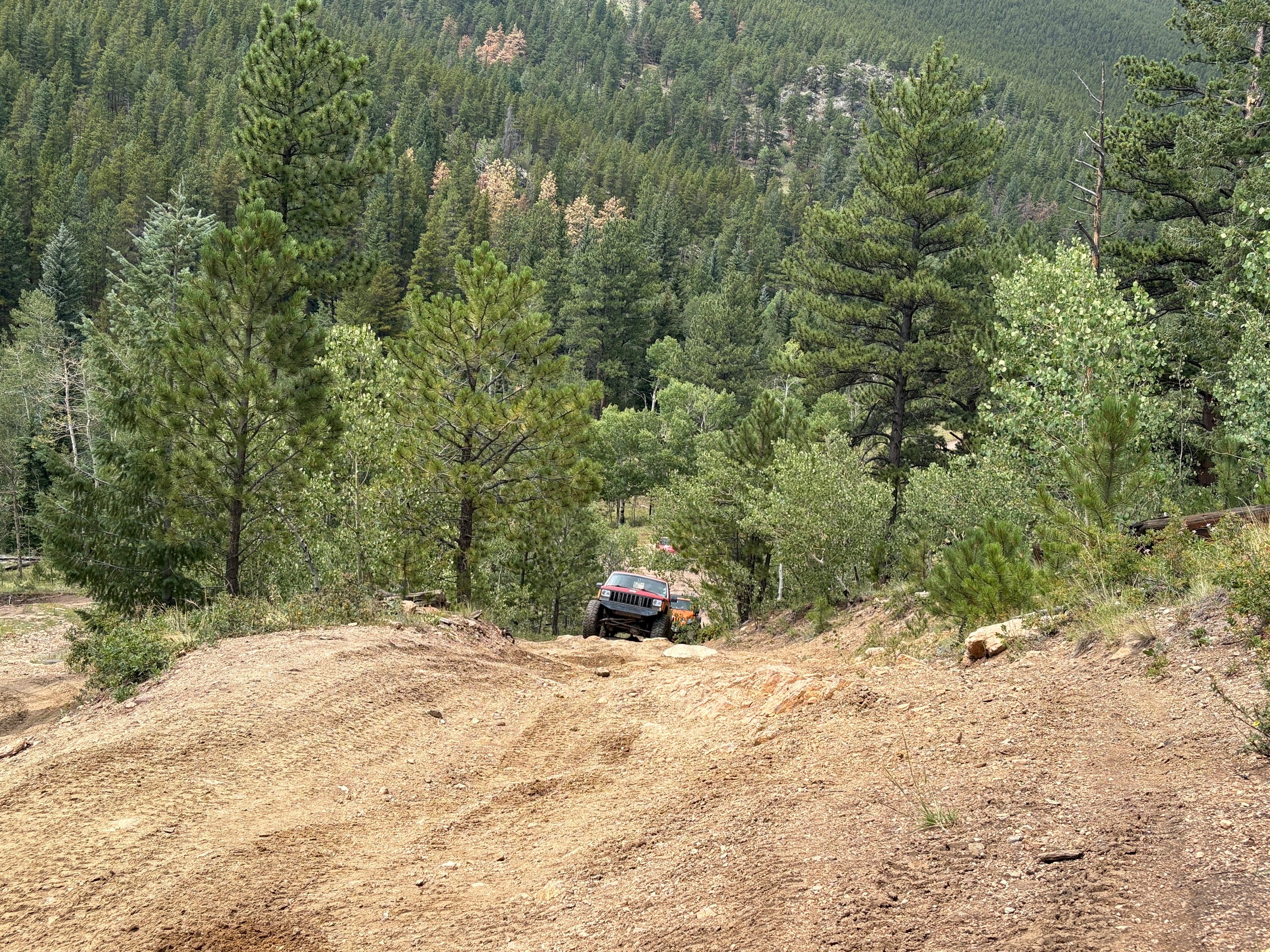 At the first small obstacle, we all went to the right side of the trail. It was easy, just a small, rocky hill climb. When we got to the "Y" in Slaughterhouse Gulch, we went to the right to run the trail clockwise. That's when Calvin's friends were coming up behind us in their Jeeps, so we let them pass us.