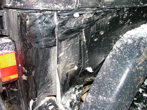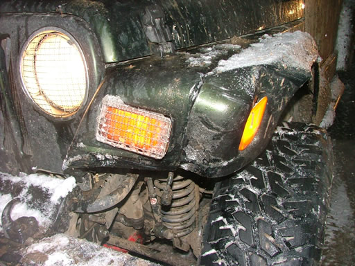 We went back to the gas station, slowing down for an accident where a 4Runner was on its side in a ditch. We aired up and were on our way out to go get pizza, but the parking lot was slick with ice. Bob couldn't stop in time, running right into Dave and causing some major trail damage to both vehicles. It's fitting that the last minute of the last run of the year ended up with some of the worst trail damage so far!