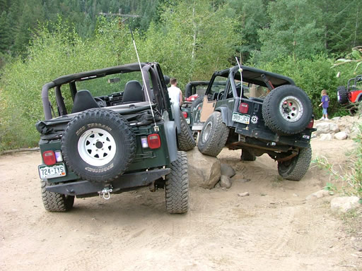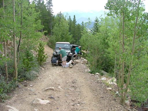 We started up the trail and Monica ran over every rock to get used to locked axles. She went over a bigger one on a switchback and looked back to watch Bob run straight into it, bending his drag link. He managed to get it pretty straightened out using a comealong. It was our first trail damage of the day.