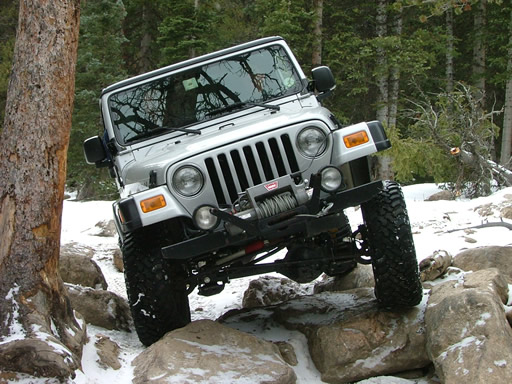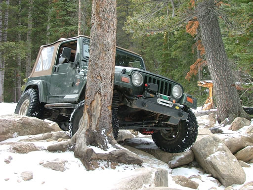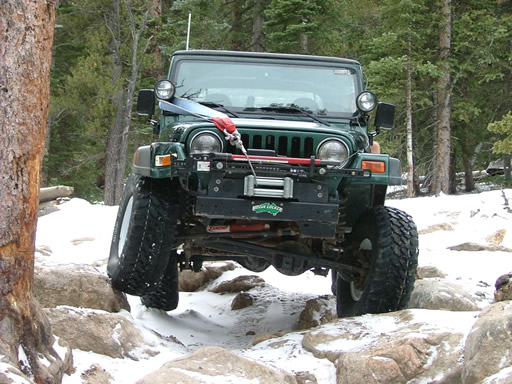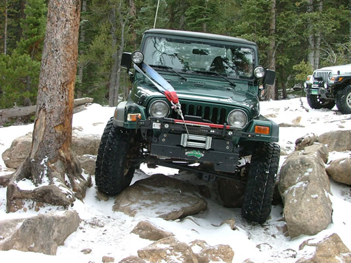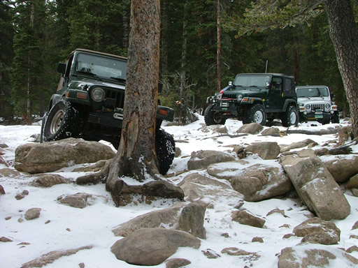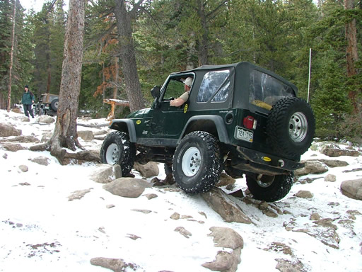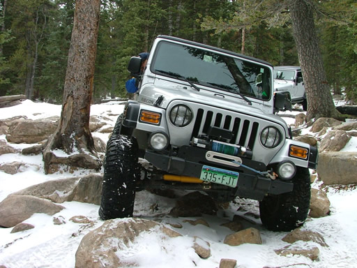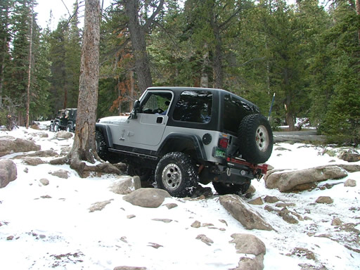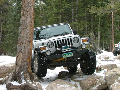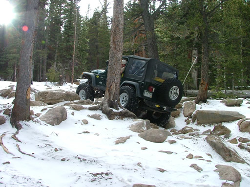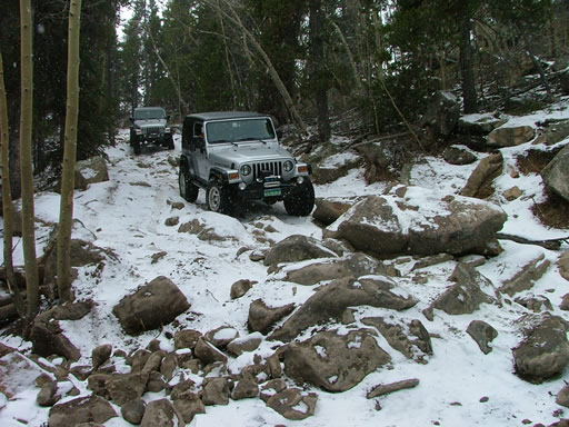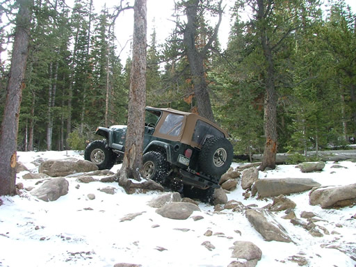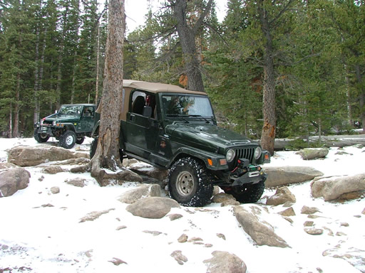 Cheryl was next, dropping down and sliding a little bit. Each Jeep that went through the snow would make it just a little bit slicker (though nothing like the 2004 trip, thankfully). That put her right into the new rock. Rather than back up and risk a broken front axle, she crawled over the new rock instead. She got pretty tippy in the next section but drove right through it.