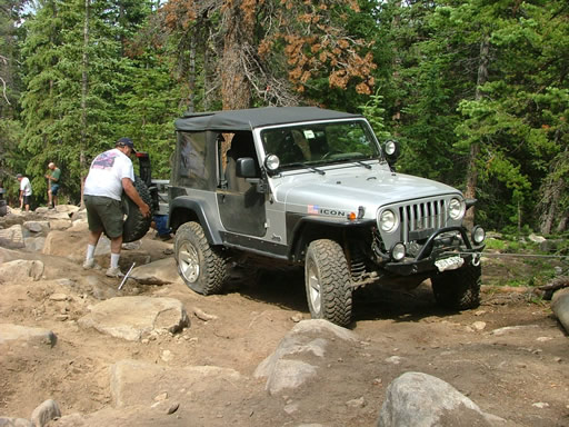 Jon used to have an XJ but it got stolen. He has had his TJ Sport for two weeks and this was his inaugural run. He was planning on going around this first obstacle, but at the last minute he changed his mind and he was in it. He took the line on the left and made it with some work. He has small tires and no lockers, but he proved that a stock TJ (non-Rubicon) can make it through the first obstacle. Nice job!