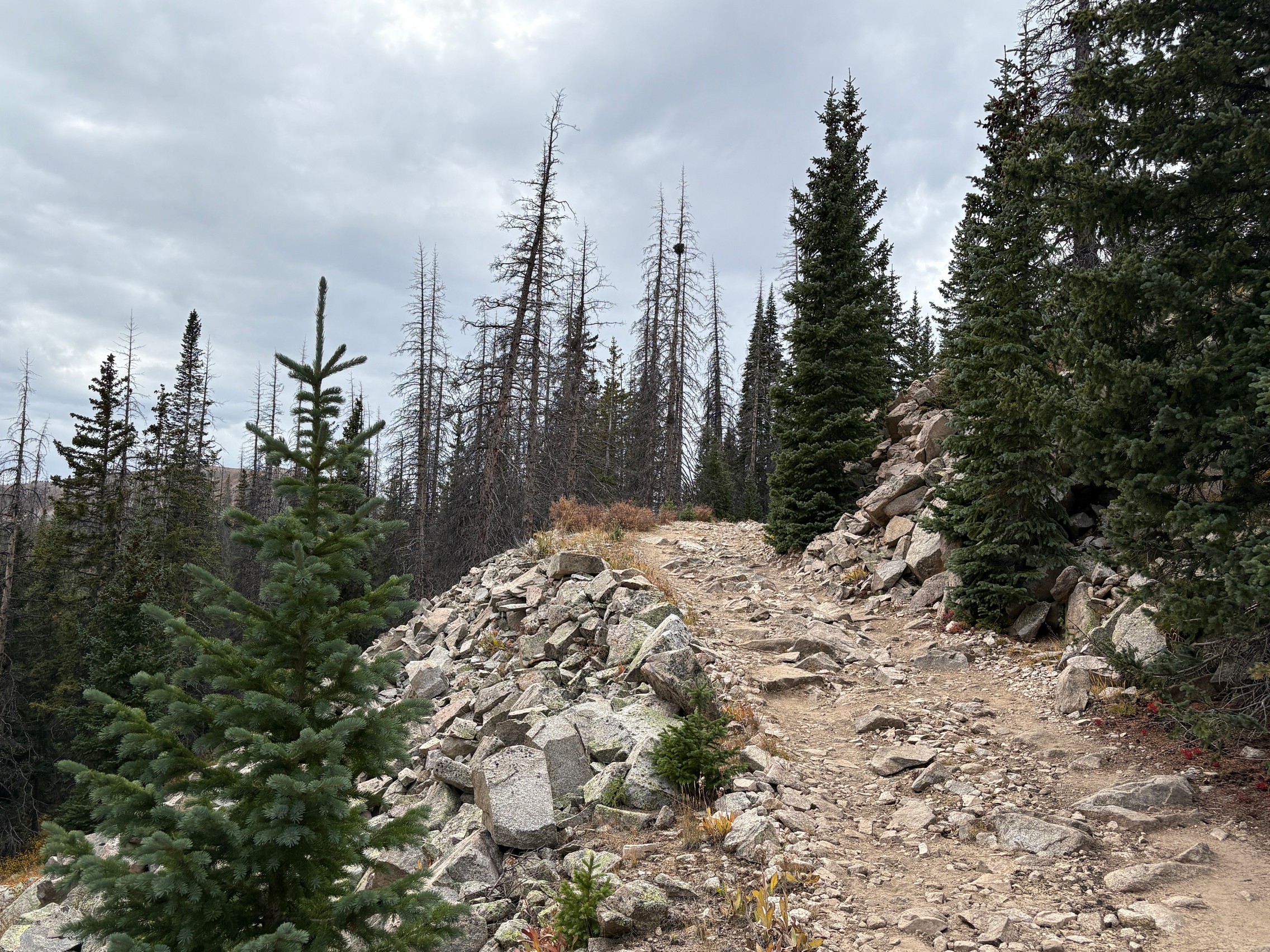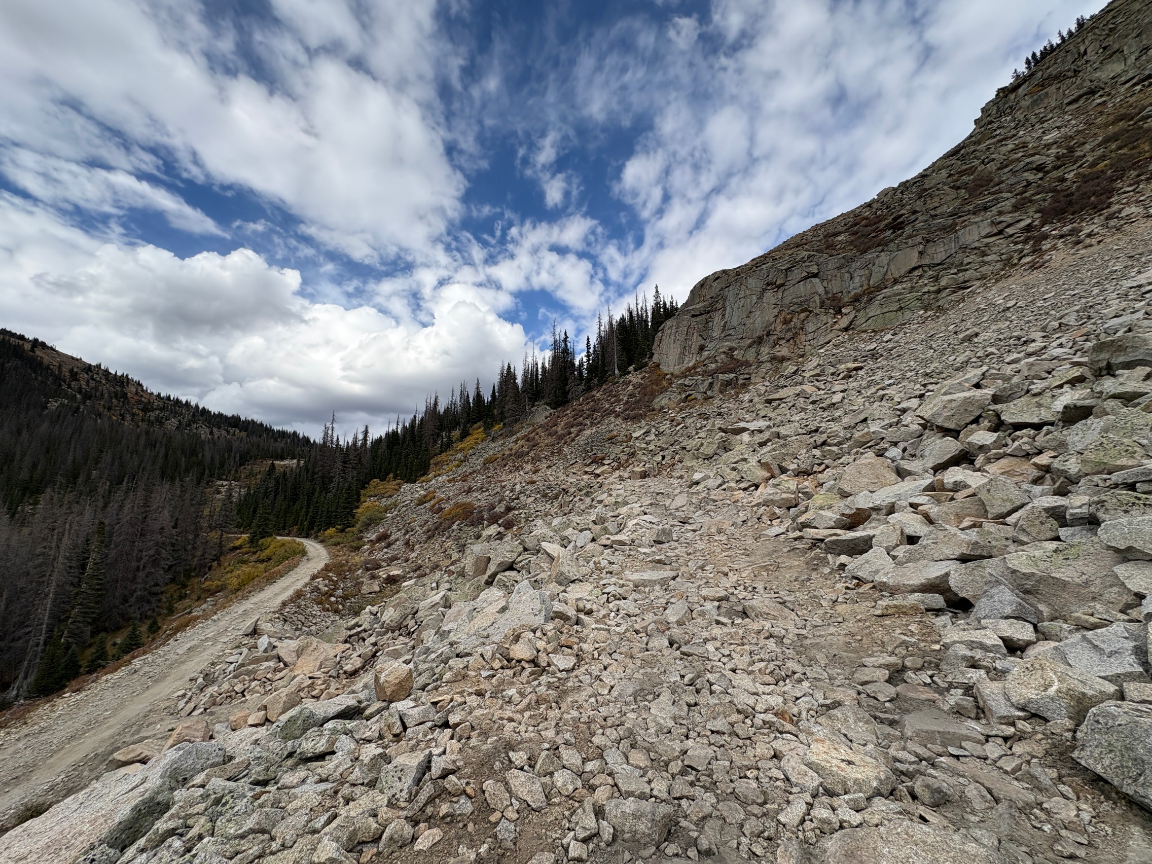 Turning from the West Portal area onto Williams Pass is a bit challenging and requires a three- or five-point maneuver to make it around the 320-degree turn to the left, up a narrow, very rocky climb. After two or three of us made the turn onto Williams Pass and started up, a side-by-side and a four-wheeler were coming down. It was nearly impossible to back out of Williams Pass again, and there was now a small traffic jam at the intersection, with some people working on the multi-point turn on their way up and others wanting to pass through on the Southpark Rail grade trail. The side-by-side driver did not seem experienced nor skilled in passing oncoming traffic in a difficult area, and this was a tricky, single vehicle area with a lot of rocks. Matt helped the side-by-side driver get up the side a bit in an area so vehicles could pass each other.