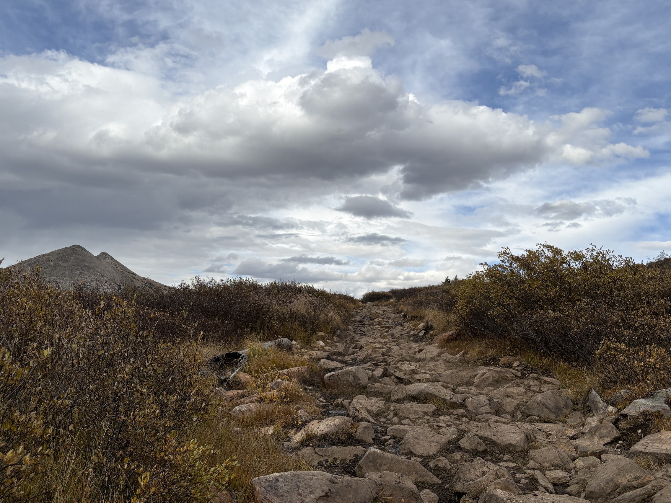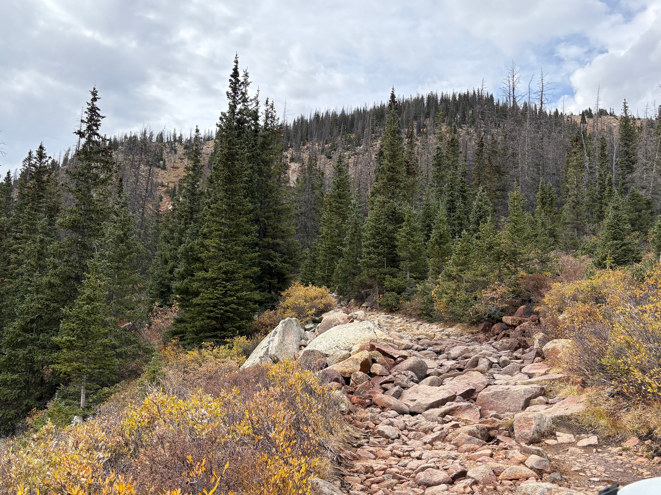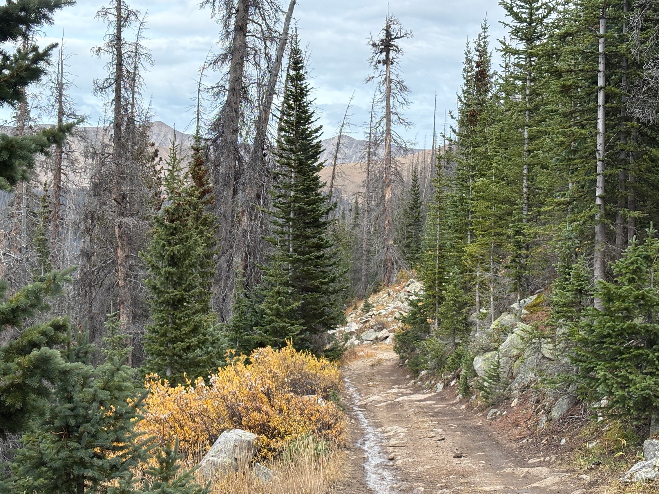Williams Pass was very scenic, wet and muddy, interspersed with big rocks and water running down the trail or crossing it. We didn't have any significant issues with the muddy and rocky trail, though a few spots were a little tricky. The view from the top of Williams Pass with all the fall colors below us in the valley around the ghost town of St. Elmo was worth the trip over Williams Pass.
